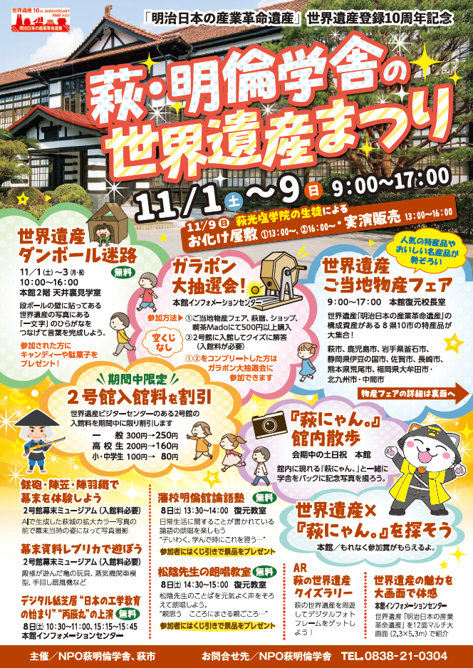 明治日本の産業革命遺産 世界遺産登録10周年を記念して、萩・明倫学舎では、下記のとおり「萩・明倫学舎の世界遺産まつり」を開催します。
