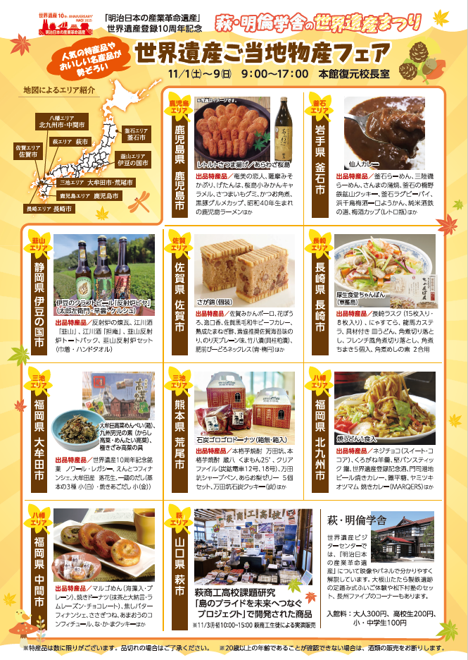 | 世界遺産ご当地物産フェア 8県10市の特産品が集合! ★11/3(月・祝)10時~15時 萩商工生徒による実演販売 | 本館1階 復元校長室 | |